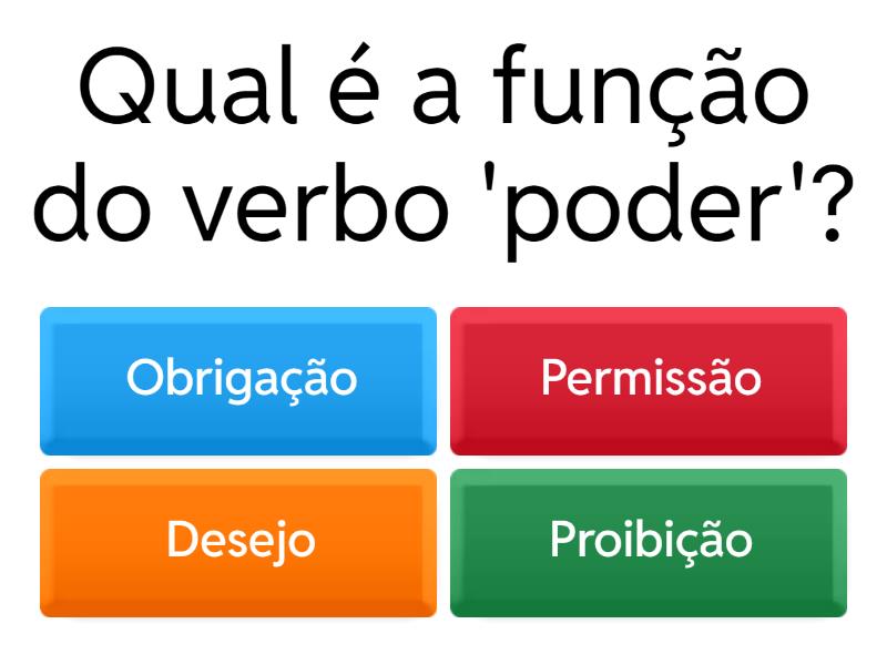 1) Qual é a função do verbo 'poder'? a) Obrigação  b) Permissão c) Desejo d) Proibição 2) Como se conjuga 'poder' na primeira pessoa do singular? a) Posso b) Pode c) Podem d) Podemos 3) Qual frase está correta? a) Eu podemos ir. b) Eu pode ir. c) Eu podem ir. d) Eu posso ir. 4) Eu posso ir - Como fica essa frase no passado? a) Eu poderei ir b) Eu pôde ir c) Eu pude ir d) Eu pode ir 5) Qual frase expressa habilidade/capacidade? a) Ele pode ir. b) Ele pode ser. c) Ele pode ter. d) Ele pode nadar. 6) Qual frase expressa permissão? a) Você pode entrar. b) Você pode correr. c) Você pode ter. d) Você pode ser. 7) Marcos não veio à aula hoje, ele ------------- estar doente! a) Posso b) Pode c) Pude d) Pôde 8) Qual está correto? a) Eu não pude ir ao cinema ontem b) Eu não pode ir ao cinema ontem c) Eu não posso ir ao cinema ontem d) Eu não podo ir ao cinema ontem 9) Nós não ---------------- observar as estrelas ontem, porque estava chovendo. a) Pudemos b) Possamos c) Podemos d) Poderei 10) Está correto dizer: a) Eu poderei correr. b) Eu puedo correr. c) Eu podirei correr. d) Eu pudemos correr.