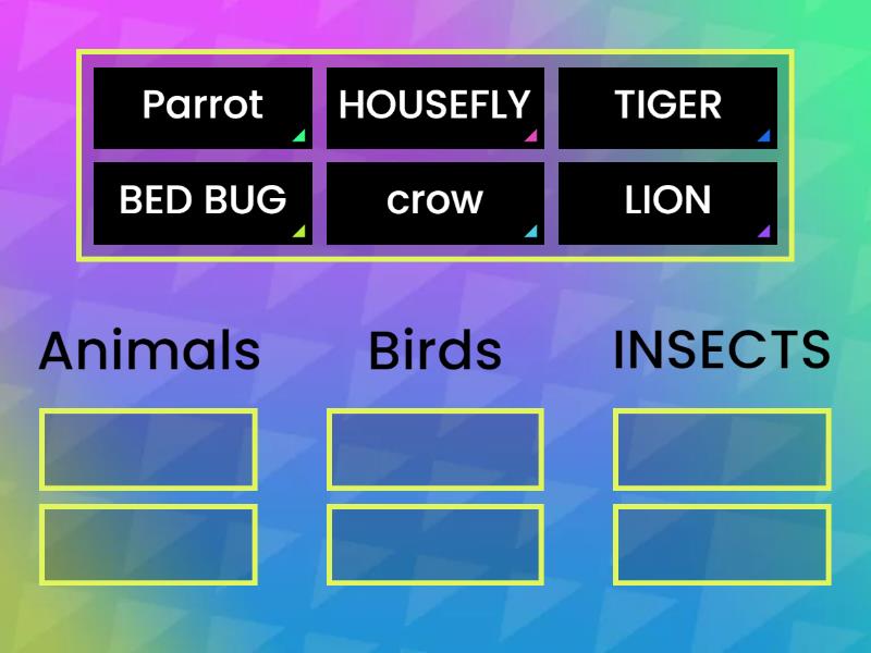 Animals: LION, TIGER, Birds: Parrot, crow, INSECTS: HOUSEFLY, BED BUG,