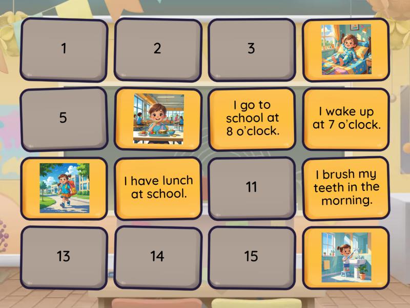 I wake up at 7 o’clock., I brush my teeth in the morning., I go to school at 8 o’clock., I have lunch at school., I play with my friends., I do my homework after school., I have dinner with my family., I go to bed at 9 o’clock.,