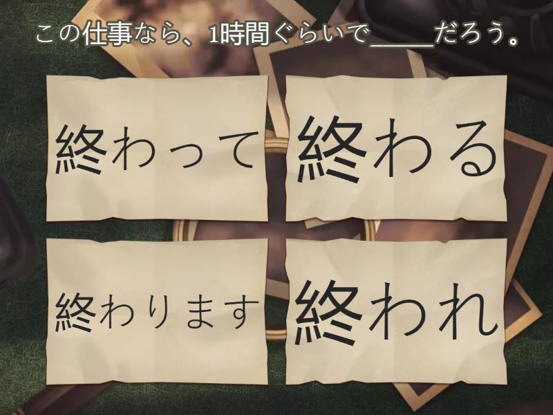 1) この仕事なら、1時間ぐらいで_____だろう。 a) 終わって b) 終わる c) 終わります d) 終われ 2) そのレストランはたぶんよやくが_____だろう。 a) ひつよう b) ひつような c) ひつように d) ひつようで 3) かばんがない。どこ_____。 a) みたい b) らしい c) ようだ d) だろう 4) 山の上はここよりもっと____だろうと思いますよ。 a) 寒く b) 寒いと c) 寒くて d) 寒い 5) あしたのパーティーはたぶん 20人ぐらい_____だろうと思います。 a) 来る b) 来て c) 来た d) 来よう 6) そこは人口が少ないですから、_____だろうと思います。 a) しずかな b) しずか c) しずかだ d) しずかに 7) 田中さんはそのニュースをまだ____かもしれない。 a) 知らない b) 知る c) 知って d) 知った 8) かのじょのごりょうしんはけっこんに____かもしれません。 a) はんたいで b) はんたいだ c) はんたい d) はんたいの 9) ____かもしれないから、セーターを持っていこう。 a) 寒かった b) 寒い c) 寒くて d) 寒く 10) あした東京にたいふが_____かもしれません。 a) 来ます b) 来よう c) 来て d) 来る 11) どうもその話は_____らしい。 a) ほんとうの b) ほんとうだ c) ほんとうな d) ほんとうじゃない 12) ニュースで言っていましたが、今年はたくさんの人が外国へ _____らしいですよ。 a) 出かけた b) 出かけて c) 出かけました d) 出かけ 13) みんなすっているから、ここでたばこをすってもいい_____。 a) ためだ b) つもりだ c) らしい d) よていだ 14) 声が聞こえます。となりのへやにだれか_____ようです。 a) いた b) いる c) いない d) いて 15) A 「どこでさいふをおとしたんですか。」 B 「よくわかりませんが、電車の中で _____ようです。」 a) おちて b) おとす c) おとした d) おちる 16) あの人はほんとうに子どもが_____ようですね。 a) 好きな b) 好きの c) 好きで d) 好きだ 17) A 「料理の味はどうですか。」B「うーん、しおが_____ ようです。」 a) たりる b) たりなく c) たりなくて d) たりない 18) まだとどいていませんか。3日で_____はずなんですが。 a) とどかない b) とどいた c) とどいて d) とどく 19) ヤンさんは10時までに来ると言っていましたから、そろそろ_____はずだ。 a) 来る b) 来て c) 来ない d) 来た 20) このカメラのほうがあのカメラより使いかたが_____はずです。 a) かんたん b) かんたんの c) かんたんな d) かんたんで 21) 田中さんのように頭のいい人がそんなやさしい問題をまちがえる_____。 a) ないはずだ b) のないはずだ c) はずがない d) はずではない