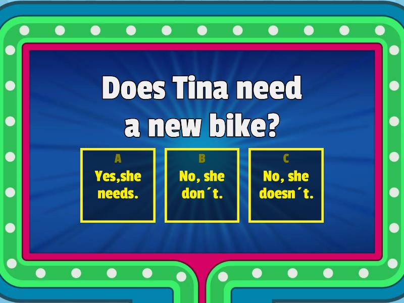1) Does your sister want to be a model? a) Yes, she does. b) No, she don´t c) Yes, she doen´t. 2) Do you have short black hair and brown eyes. a) Yes, I has b) No, I doesn´t c) Yes, I do 3) Do they need .to finish your activities? a) Yes, they does b) No, they doesn´t c) Yes, they do. 4) Does "Ensino Fundamental" in Brazil take five years? a) Yes, it do. b) Yes, it does c) Yes, it takes 5) Do you usually listen to Pop Rock music? a) Yes, I do. b) No, I do. c) Yes, I am. 6) Do you like physics? a) Yes, they do b) Yes, we do. c) No, he doesn´t. 7) Does your mom cook good food? a) Yes, she does b) No, she don´t. c) Yes, she cooks. 8) Does Tina need a new bike? a) Yes,she needs. b) No, she don´t. c) No, she doesn´t.