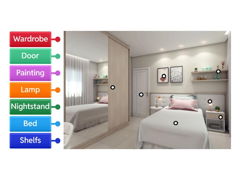 Bed, Wardrobe, Lamp, Nightstand, Painting, Shelfs, Door.