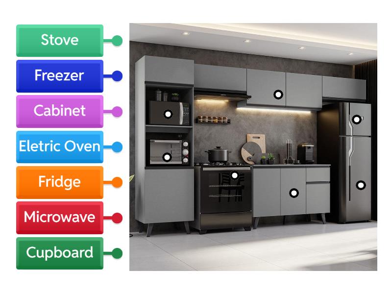 Eletric Oven, Microwave, Fridge, Cupboard, Cabinet, Freezer, Stove.
