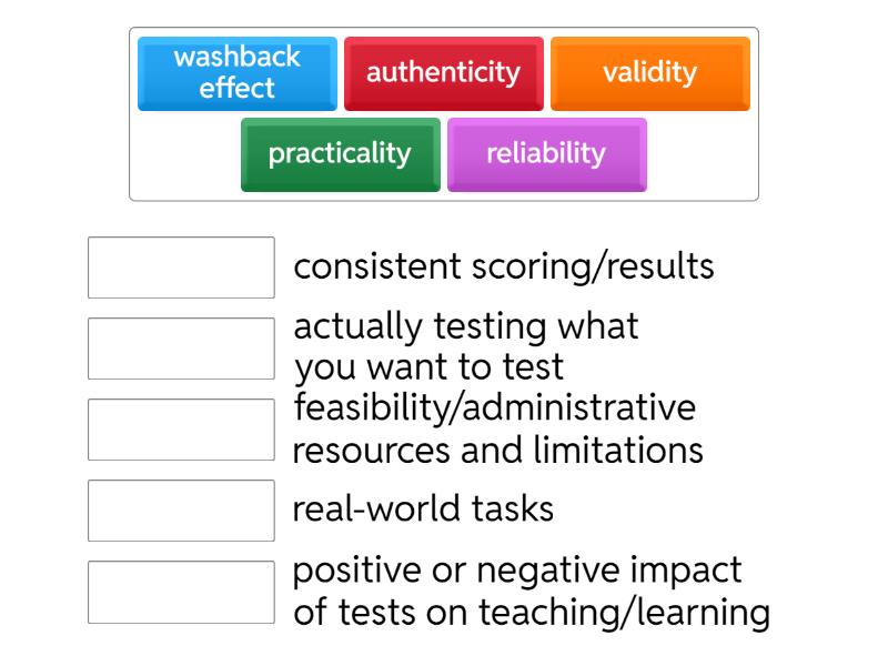LT&A > Lesson 2 >Principles of language assessment: Validity, Reliability, Backwash effect, Practicality and Authenticit