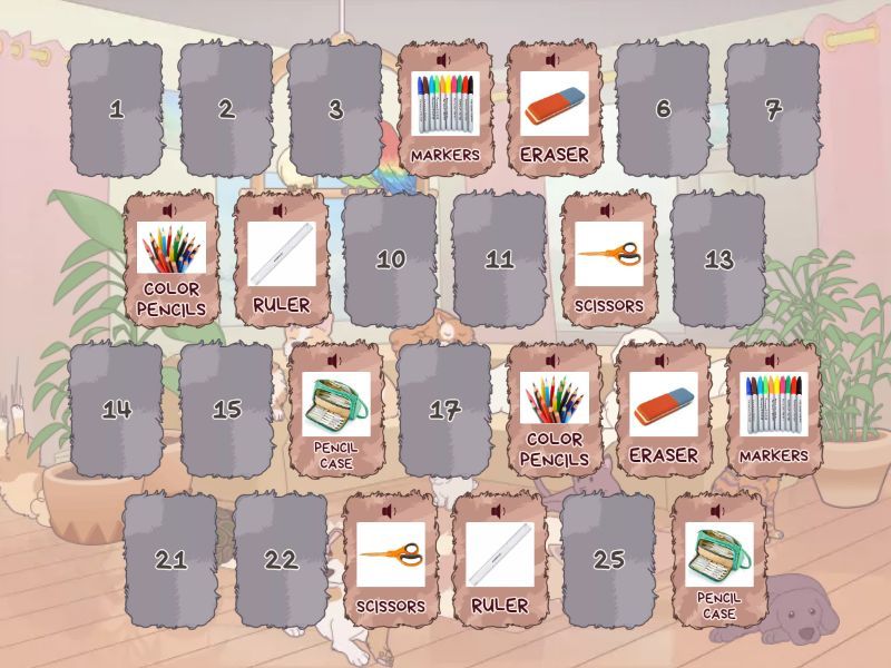 ERASER, COLOR PENCILS, MARKERS, SCISSORS, RULER, PENCIL CASE, GLUE, SHARPENER, PEN, SCHOOL BAG, BOOKS, HIGHLIGHTER, CRAYON,