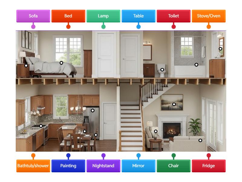 Table, Fridge, Stove/Oven, Chair, Sofa, Painting, Lamp, Bed, Nightstand, Mirror, Toilet, Bathtub/shower.