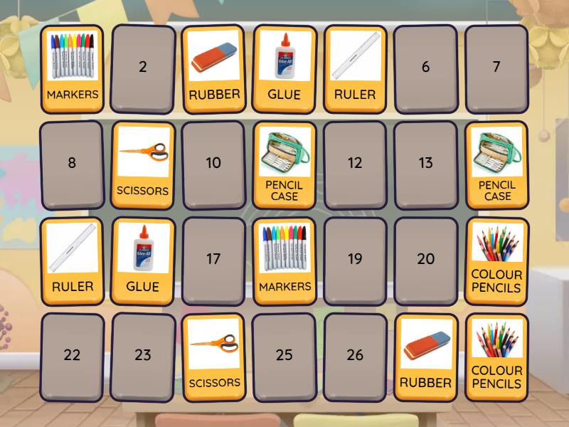 RUBBER, COLOUR PENCILS, MARKERS, SCISSORS, RULER, PENCIL CASE, GLUE, SHARPENER, PEN, WRITING PENCIL, SCHOOL BAG, BOOKS, HIGHLIGHTER, CRAYON,