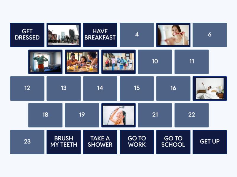 GET UP, BRUSH MY TEETH, TAKE A SHOWER, GET DRESSED, HAVE BREAKFAST, GO TO WORK, GO TO SCHOOL, HAVE LUNCH, TAKE A NAP, DO HOMEWORK, WORK OUT, HAVE DINNER, WATCH TV, SLEEP,
