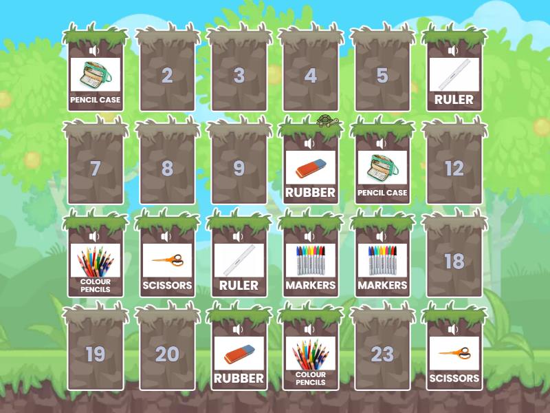 RUBBER, COLOUR PENCILS, MARKERS, SCISSORS, RULER, PENCIL CASE, GLUE, SHARPENER, PEN, SCHOOL BAG, BOOK, CRAYON,