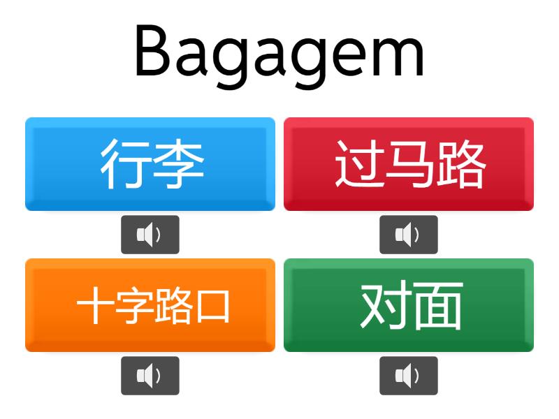 1) Bagagem a) 行李 b) 过马路 c) 十字路口 d) 对面 2) Endereço a) 西 b) 车站在哪里? c) 对面 d) 地址 3) Centro da cidade a) 直走 b) 往后走 c) 行李 d) 市中心 4) Onde é o ponto de ônibus? a) 车站在哪里? b) 右转 c) 下楼 d) 行李 5) WeChat Pay a) 微信支付 b) 车站在哪里? c) 过马路 d) 厕所怎么走? 6) Vire à direita a) 菜单 b) 右转 c) 往后走 d) 下楼 7) Siga em frente a) 直走 b) 地址 c) 西 d) 厕所怎么走? 8) Onde é o banheiro? a) 市中心 b) 厕所怎么走? c) 车站在哪里? d) 电梯 9) Descer as escadas a) 扫码 b) 微信支付 c) 西 d) 下楼 10) Vá para trás a) 直走 b) 过马路 c) 炒面 d) 往后走 11) Oeste a) 西 b) 直走 c) 市中心 d) 大概半小时 12) Cruzamento a) 十字路口 b) 扫码 c) 车站在哪里? d) 警察 13) Elevador a) 电梯 b) 直走 c) 下楼 d) 地址 14) Polícia a) 警察 b) 菜单 c) 十字路口 d) 对面 15) Cerca de meia hora a) 电梯 b) 市中心 c) 大概半小时 d) 十字路口 16) Atravessar a rua a) 西 b) 电梯 c) 市中心 d) 过马路 17) outro lado  a) 对面 b) 车站在哪里? c) 警察 d) 过马路 18) Escanear código a) 西 b) 过马路 c) 下楼 d) 扫码 19) Macarrão frito (como yakisoba) a) 扫码 b) 菜单 c) 西 d) 炒面 20) Cardápio a) 往后走 b) 菜单 c) 厕所怎么走? d) 炒面
