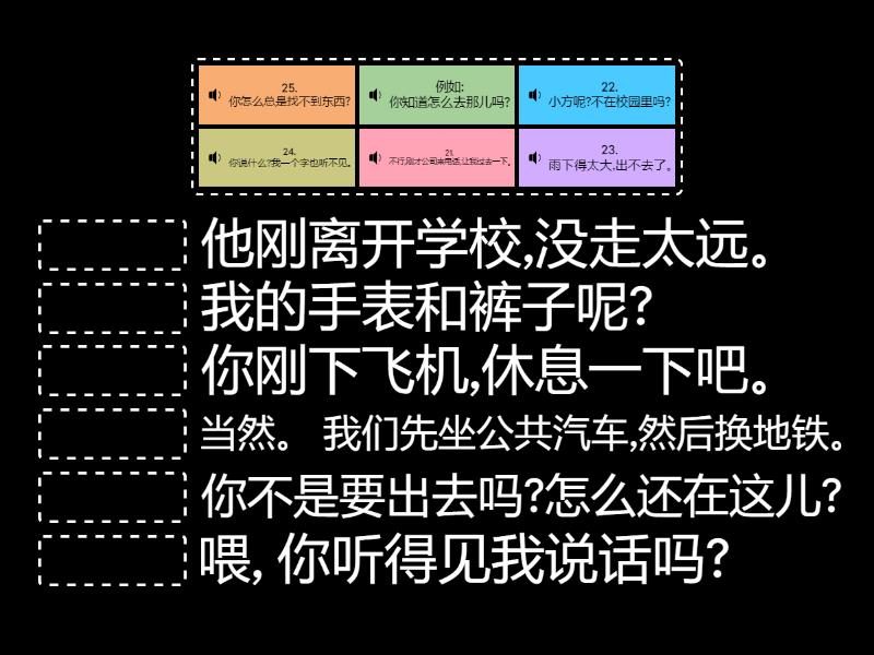 例如: 你知道怎么去那儿吗? - 当然。 我们先坐公共汽车,然后换地铁。, 21. 不行,刚才公司来电话,让我过去一下。 - 你刚下飞机,休息一下吧。, 22. 小方呢?不在校园里吗? - 他刚离开学校,没走太远。, 23. 雨下得太大,出不去了。 - 你不是要出去吗?怎么还在这儿?, 24. 你说什么?我一个字也听不见。 - 喂, 你听得见我说话吗?, 25. 你怎么总是找不到东西? - 我的手表和裤子呢?,