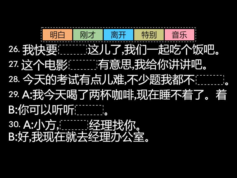 26. 我快要____这儿了,我们一起吃个饭吧。 27. 这个电影____有意思,我给你讲讲吧。 28. 今天的考试有点儿难,不少题我都不____。 29. A:我今天喝了两杯咖啡,现在睡不着了。着 B:你可以听听____。 30. A:小方,____经理找你。 B:好,我现在就去经理办公室。
