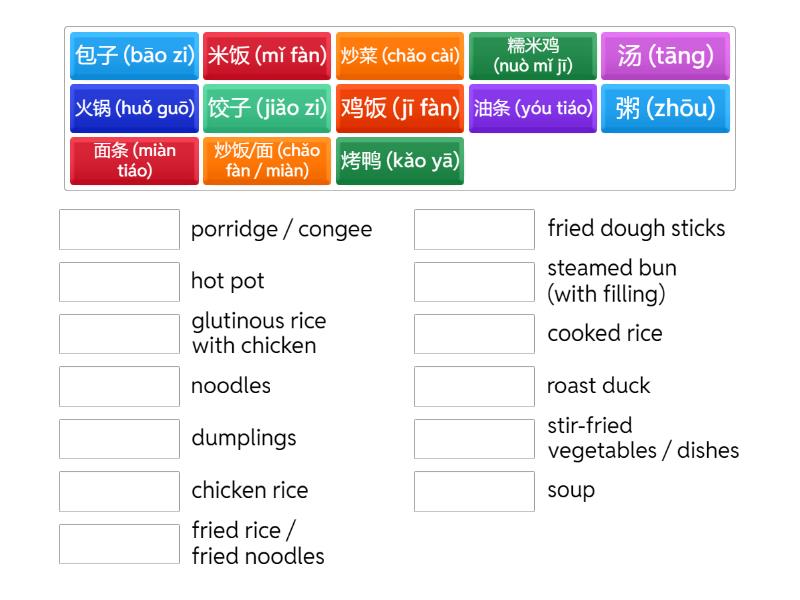 米饭 (mǐ fàn) - cooked rice, 面条 (miàn tiáo) - noodles, 包子 (bāo zi) - steamed bun (with filling), 饺子 (jiǎo zi) - dumplings, 油条 (yóu tiáo) - fried dough sticks, 粥 (zhōu) - porridge / congee, 汤 (tāng) - soup, 炒饭/面 (chǎo fàn / miàn) - fried rice / fried noodles, 鸡饭 (jī fàn) - chicken rice, 烤鸭 (kǎo yā) - roast duck, 火锅 (huǒ guō) - hot pot, 糯米鸡 (nuò mǐ jī) - glutinous rice with chicken , 炒菜 (chǎo cài) - stir-fried vegetables / dishes,