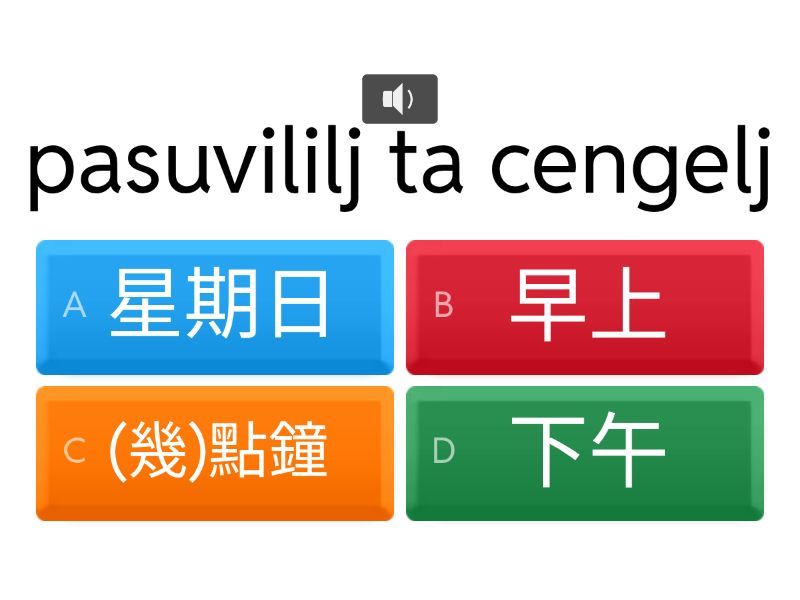 1) qezemezemetj a) 晚上 b) 昨天 c) 明天 d) 今天 2) tatiyaw a) 晚上 b) 昨天 c) 明天 d) 今天 3) nutiyaw a) 晚上 b) 昨天 c) 明天 d) 今天 4) tucu a qadaw/tasauni a) 晚上 b) 昨天 c) 明天 d) 今天 5) kadjamadjaman a) 早上 b) 下午 c) (幾)點鐘 d) 星期日 6) pasuvililj ta cengelj a) 早上 b) 下午 c) (幾)點鐘 d) 星期日 7) milingan a) 早上 b) 下午 c) (幾)點鐘 d) 星期日 8) niciyu a) 早上 b) 下午 c) (幾)點鐘 d) 星期日 9) cavilj a) 年 b) 天天 c) 現在 d) 生日 10) ljemita tu qadaw a) 年 b) 天天 c) 現在 d) 生日 11) tucu a) 年 b) 天天 c) 現在 d) 生日 12) pinualjakan a qadaw a) 年 b) 天天 c) 現在 d) 生日