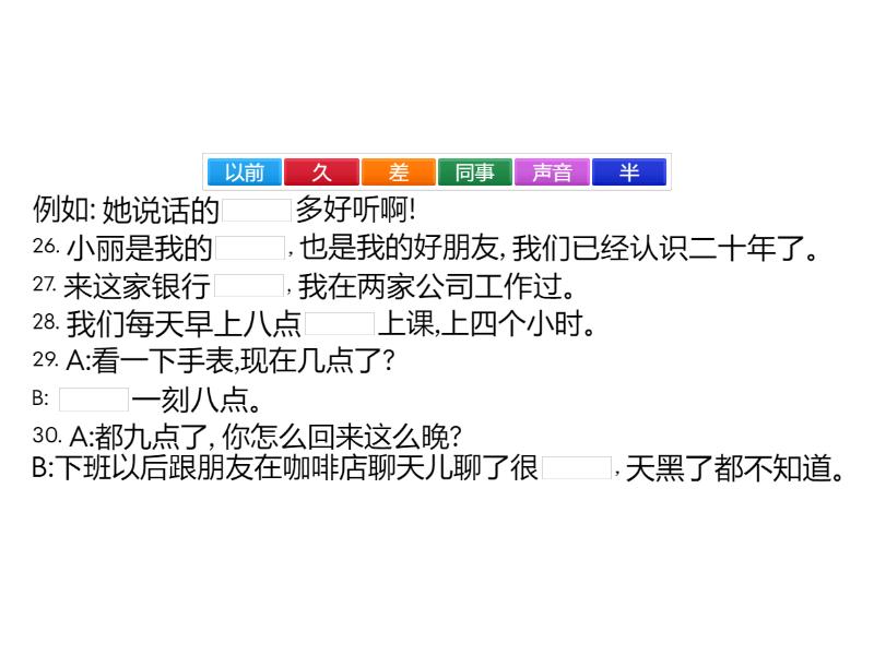 例如: 她说话的____多好听啊! 26. 小丽是我的____, 也是我的好朋友, 我们已经认识二十年了。 27. 来这家银行____, 我在两家公司工作过。 28. 我们每天早上八点____上课,上四个小时。 29. A:看一下手表,现在几点了? B: ____一刻八点。 30. A:都九点了, 你怎么回来这么晚? B:下班以后跟朋友在咖啡店聊天儿聊了很____, 天黑了都不知道。