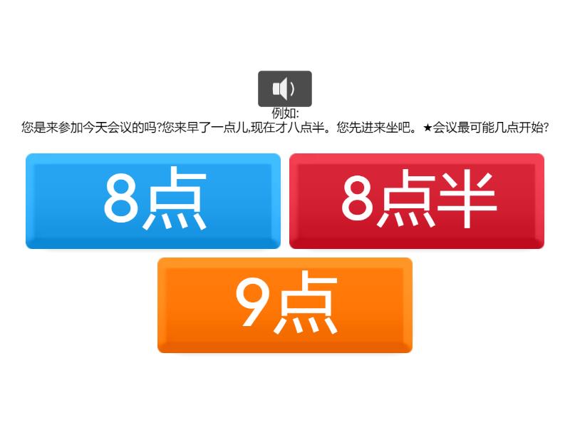1) 例如: 您是来参加今天会议的吗?您来早了一点儿,现在才八点半。您先进来坐吧。★会议最可能几点开始? a) 8点 b) 8点半 c) 9点 2) 31. 六个月大的女儿对音乐很感兴趣。她不高兴的时候,唱歌给她听或者让她听听音乐, 一会儿她就笑了。 ★她的女儿: a) 喜欢音乐 b) 不喜欢听歌 c) 六岁了 3) 32. 我在北京住过十年,吃了不少北京菜,学了不少中国文化,现在还都记得。 ★我: a) 现在住在北京 b) 现在不住在北京 c) 是北京人 4) 33. 我妹妹不喜欢画画儿、唱歌,只对踢足球感兴趣。她会踢足球,也爱看足球比赛。 ★ 我妹妹喜欢: a) 唱歌 b) 踢足球 c) 画画儿 5) 34. 以前中国人结婚的时候,男女都不认识。丈夫会在结婚迎接妻子那天第一次见到妻子,妻子也第一次见到丈夫。★ 以前中国人结婚,丈夫: a) 对妻子不感兴趣 b) 以前就认识妻子 c) 结婚那天第一次见到妻子 6) 35. 很多年轻人说不知道怎么找工作,总觉得自己的工作不好。有的人都工作了好几年了,钱也不少,但还不知道喜欢做什么。我觉得找工作的时候,兴趣第一,怎么能把 钱放在第一呢? ★ 我觉得找工作的时候要看: a) 公司给多少钱 b) 喜欢不喜欢 c) 工作时间是多少