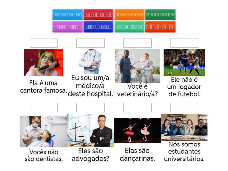 わたしはこのびょういんのいしゃです。 - Eu sou um/a médico/a deste hospital., あなたはじゅういですか。 - Você é veterinário/a?, かれはサッカーせんしゅではないです。 - Ele não é um jogador de futebol., かのじょはゆうめいなかしゅです。 - Ela é uma cantora famosa., わたしたちはだいがくせいです。 - Nós somos estudantes universitários., きみたちははいしゃではないです。 - Vocês não são dentistas., かれらはべんごしですか。 - Eles são advogados?, かのじょらはおどりてです。 - Elas são dançarinas.,