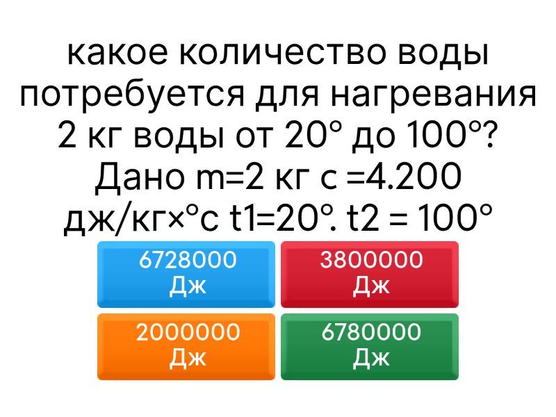 1) какое количество воды потребуется для нагревания 2 кг воды от 20° до 100°? Дано m=2 кг c =4.200 дж/кг×°с t1=20°. t2 = 100° a) 6728000 Дж b) 3800000 Дж c) 2000000 Дж d) 6780000 Дж 2) медную медаль массой 50 кг нагрели от 20° до 120°. Сколько теплоты передано детали? Дано m=50 г c=400 Дж/кг×°c a) 10000 Дж b) 15000 Дж c) 20000 Дж d) 8000 Дж 3) До какой температуры остынет 3 л воды взятой при t=80°, если она отдала 252 кДж теплоты? Дано объём 3 л c= 4.200 дж/кг×°c t1 = 80° Q= 252000 Дж a) 40° b) 50° c) 35° d) 60° 4) какое количество теплоты нужно чтобы расплавить 100 г льда при температуре 0°? Дано m=100 г лямда=340000 дж/кг a) 34000 Дж b) 15000 Дж c) 1 Дж d) 35000 Дж 5) сколько теплоты потребуется чтобы лёд массой 2 кг при -10° превратился в воду при 20°? Дано масса 2 кг с(льда)=2100 Дж/кг×°с с(воды)=4200 Дж/(кг×°с) a) 800000 Дж b) 890000 Дж c) 900000 Дж d) 690000 Дж