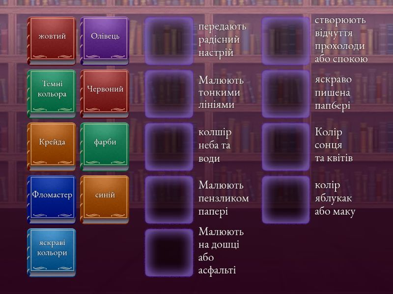 Олівець - Малюють тонкими лініями, фарби  - Малюють пензликом папері, Крейда - Малюють на дошці або асфальті, Фломастер - яскраво пишена пап6ері, Червоний - колір яблукак або маку, жовтий - Колір сонця та квітів, синій - колшір неба та води, яскраві кольори - передають радісний настрій, Темні кольора - створюють відчуття прохолоди або спокою,