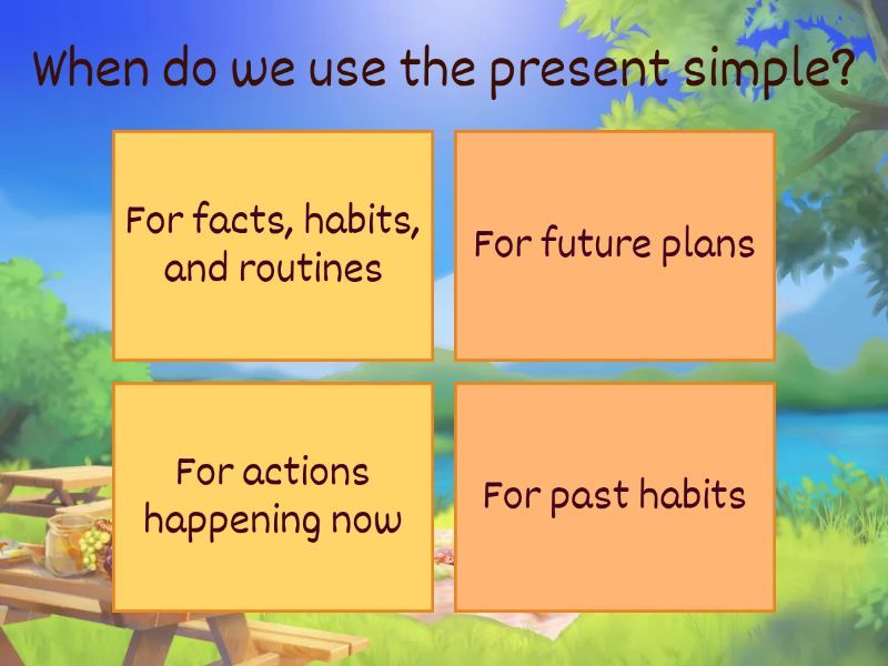 1) When do we use the present simple? a) For facts, habits, and routines b) For future plans c) For actions happening now d) For past habits 2) Which sentence is in the present simple? a) She is going to school now. b) She goes to school every day. c) She went to school yesterday. d) She will go to school tomorrow. 3) Which time expression matches the present simple? a) every day b) right now c) at the moment d) this week 4) We use the present simple for future events when they are… a) planned and scheduled b) decided suddenly c) not sure yet d) maybe happening 5) Which adverb of frequency is NOT used with present simple? a) always b) sometimes c) right now d) never 6) What is the present continuous used for? a) Future habits b) Past events c) Things that never change d) Actions happening at the moment 7) Which sentence is correct in the present continuous? a) I am watching TV now. b) I watch TV now. c) I watched TV now. d) I watching TV now. 8) Which time expression goes with the present continuous? a) every morning b) usually c) at the moment d) on Sundays 9) We use “always” in present continuous to show… a) something annoying b) something true c) something planned d) something else 10) Choose the correct rule: We use the present continuous for… a) temporary or changing situations b) scientific facts c) habits d) permanent jobs 11) “I live in Hanoi” means… a) I’m staying there for a short time. b) I’m moving there soon. c) I’m visiting for the weekend. d) It’s my permanent home. 12) “I’m living in Hanoi” means… a) It’s temporary b) It’s permanent c) It’s a fact of nature d) It’s a habit 13) Which sentence shows an annoying habit? a) He never loses his keys. b) He loses his keys every day. c) He lost his keys yesterday. d) He’s always losing his keys! 14) Which tense is used in this sentence? “Our bus leaves at 10:00.” a) Present simple b) Present continuous c) Future simple d) Past simple 15) Which sentence describes an action happening right now? a) She is talking on the phone. b) She talks on the phone every day. c) She talked on the phone. d) She will talk on the phone later. 16) What are stative verbs? a) Verbs that describe actions b) Verbs that describe states or feelings c) Verbs about movement d) Verbs about time 17) Which verb is stative? a) know b) run c) hate d) think 18) Which verb CANNOT be used in the continuous form? a) like b) study c) work d) play 19) Which sentence is correct? a) I am liking this movie. b) I likes this movie. c) I liked this movie now. d) I like this movie. 20) Which sentence uses a stative verb incorrectly? a) She’s knowing the answer. b) I love this song. c) They believe the story. d) He understands the lesson. 21) What do we use to talk about developing situations? a) Present simple b) Future simple c) Past simple d) Present continuous 22) Which sentence shows a temporary situation? a) I’m staying with my aunt this week. b) I stay with my aunt every week. c) I stayed with my aunt last week. d) I will stay with my aunt. 23) “The train leaves at 6:30.” This is… a) a temporary action b) a scheduled event c) a developing situation d) an annoying habit 24) “He’s studying to be a doctor.” shows… a) a changing situation b) a permanent job c) a past event d) a future schedule 25) Which of these verbs can be both stative and action? a) think b) run c) play d) dance
