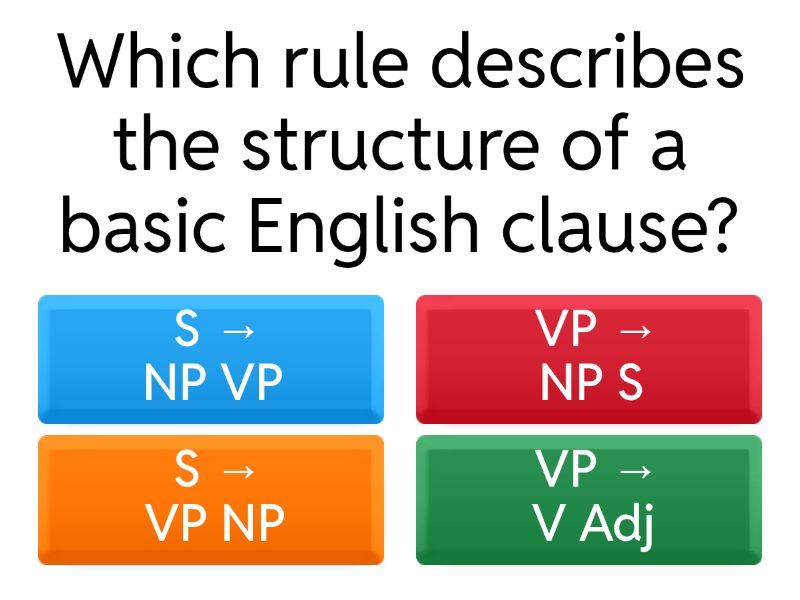 1) Which rule describes the structure of a basic English clause? a) S → NP VP b) VP → NP S c) S → VP NP d) VP → V Adj 2) Which of these is a finite verb form? a) to eat b) eating c) eats d) eaten 3) Which clause contains one finite verb? a) The boy arrived and the girl left. b) The boy arrived. c) The boy said the girl arrived. d) The boy to arrive. 4) In The boy said [the girl arrived], how many clauses are there? a) 1 b) 4 c) 3 d) 2 5) Which word is the finite verb in She has been reading? a) reading b) been c) has d) she 6) What type of verb is must in She must leave soon? a) main verb b) modal auxiliary c) aspectual auxiliary d) non-finite verb 7) Which sentence shows coordination? a) The girl laughed and the boy cried. b) The girl laughed. c) The girl thought the boy cried. d) The boy to cry. 8) Which sentence shows subordination? a) The student slept. b) To sleep early is good. c) The student slept and the teacher read. d) I think that the student slept. 9) Which verb is non-finite? a) runs b) ran c) to run d) running and runs (both finite) 10) In The boy arrived and the girl left, how many finite verbs are there? a) 1 b) none c) 3 d) 2 11) Each clause normally has … a) two finite verbs b) one finite verb c) no finite verbs d) only auxiliaries 12) In She did not go, which word carries tense? a) did b) not c) go d) she 13) Which sentence is simple (one clause only)? a) The boy to arrive. b) The boy arrived and the girl left. c) The boy said the girl arrived. d) The boy arrived. 14) In The boy tried [to sleep], the embedded clause to sleep is … a) finite b) coordinated c) non-finite d) imperative 15) What does this tree represent? [S [NP The boy] [VP bought [NP a book]]] a) Two coordinated clauses b) A simple sentence with subject + verb + object c) A subordinate clause d) A noun phrase 16) Which sentence has two clauses joined by and? a) The dog barked at the cat. b) The dog barked and the cat ran. c) The barking dog scared the cat. d) To bark and to run is fun. 17) Identify the main verb in The students are studying syntax. a) are b) students c) studying d) syntax 18) In To read books is fun, the clause To read books functions as … a) the subject of the sentence b) an object c) a prepositional phrase d) a finite verb 19) Which clause is non-finite? a) She writes daily. b) They were tired. c) He did write daily. d) To write daily is hard. 20) True or false: Every clause must contain a finite verb. a) False b) True