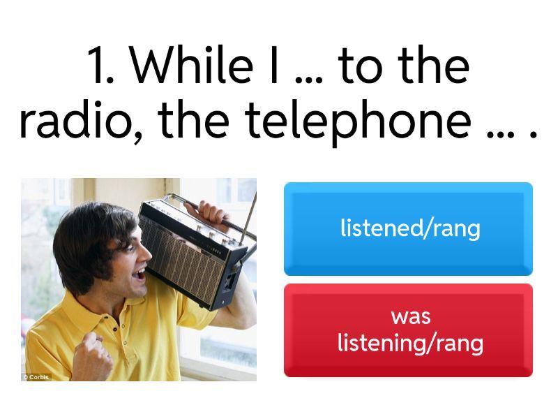 1) 1. While I ... to the radio, the telephone ... . a) listened/rang b) was listening/rang 2) 3. They ... to the orchestra when the pianist ... a) listened/stand up b) were listening/stood up c) were listening/was standing up 3) 5. We ... an accident while we ... for the bus. a) were seeing/were waiting b) were seeing/waited c) saw/were waiting 4) 6. She ... quietly at her desk when the door ... and her daughter ... in. a) worked/opened/ran b) was working/opened/ran c) was working/was opening/was running 5) 7. While she ... lunch, she ... her finger. a) was preparing/was cutting b) prepared/cut c) was preparing/cut 6) 8. We ... her while we ... in Italy. a) met/were living b) met/lived c) were meeting/were living 7) 9. Which countries ... while they ... round the world? a) did they visit/travelled b) were they visiting/were travelling c) did they visit/were travelling 8) 10. ... in the garden when I ... home? a) Were you working/came b) Did you work/was coming c) Did you work/came