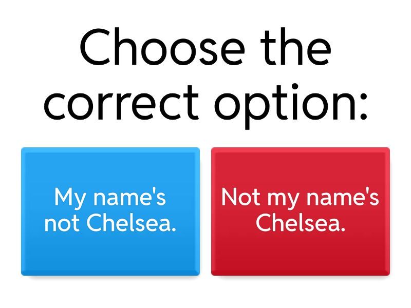 1) Choose the correct option: a) My name's not Chelsea.  b) Not my name's Chelsea. 2) Choose the correct option: a) It's a large coffee - small not. b) It's a large coffee - not small. 3) Choose the correct option: a) I is not from New York. b) I'm not from New York. 4) Choose the correct option: a) How old you are? b) How old are you? 5) Choose the correct option: a) Where is she from? b) Where she's from? 6) Choose the correct option: a) I'm no Leo. b) Are you Leo? 7) Choose the correct option: a) He's her brother. Her name's Pedro.  b) His her brother. His name's Pedro. 8) Choose the correct option: a) They is not from here. b) They're not from here.