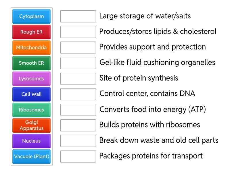 Nucleus - Control center, contains DNA, Ribosomes - Site of protein synthesis, Cytoplasm - Gel-like fluid cushioning organelles, Golgi Apparatus - Packages proteins for transport, Lysosomes - Break down waste and old cell parts, Mitochondria - Converts food into energy (ATP), Rough ER - Builds proteins with ribosomes, Smooth ER - Produces/stores lipids & cholesterol, Vacuole (Plant) - Large storage of water/salts, Cell Wall - Provides support and protection,