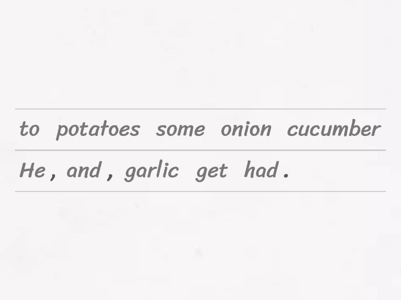 He had to get some cucumber, potatoes, onion and garlic., Dave's mum bought the cake, milk and biscuits., My hobbies are football, tennis, skateboarding and hockey., My parrot is red, blue, yellow and green., The drawer was full of pens, pencils, rubbers and staples., There were horses, pigs, chickens and goats on the farm., They searched all day for butterflies, spiders and caterpillars.,