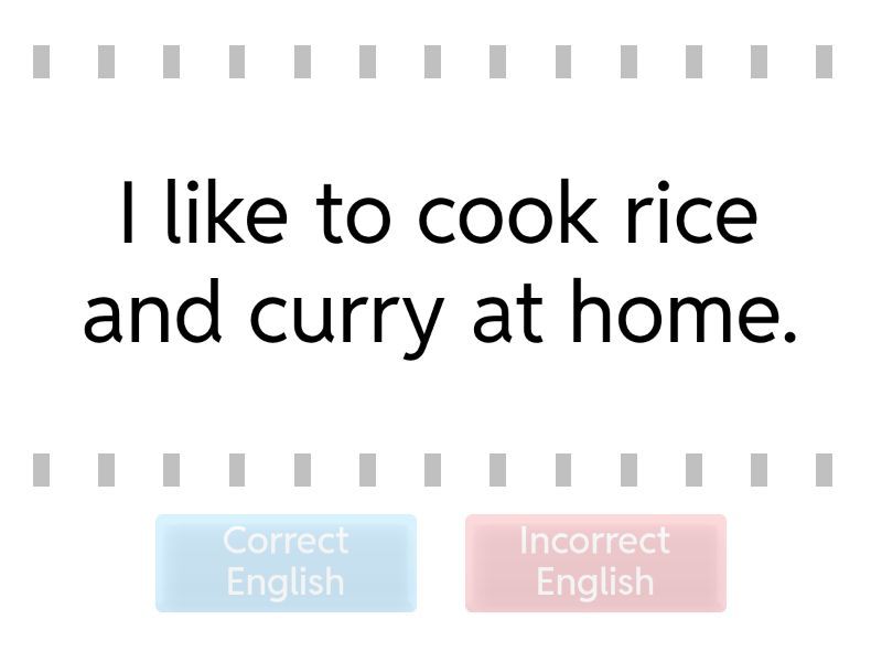Correct English: I like to cook rice and curry at home., My favourite food is kebab and salad., I went shopping last weekend with my family., We visited Liverpool because there was a football match., I am going to celebrate my next birthday at home., Incorrect English: I and my family go to Istanbul. (word order + tense), I like cook kabuli pilau., I little understand cooking., I enjoy to eat rice and meat., I cooks three day a week., I really like eat vegetables., I go shopping yesterday., I visit Liverpool last weekend., I go mostly Friday to temple., I was visited Sheffield last week., My next birthday celebrating with my family.,