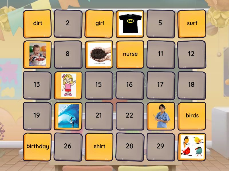 surf, nurse, birds, birthday, shirt, girl, dirt, popcorn, turkey, star, shark, tiger, spider, numbers, first,