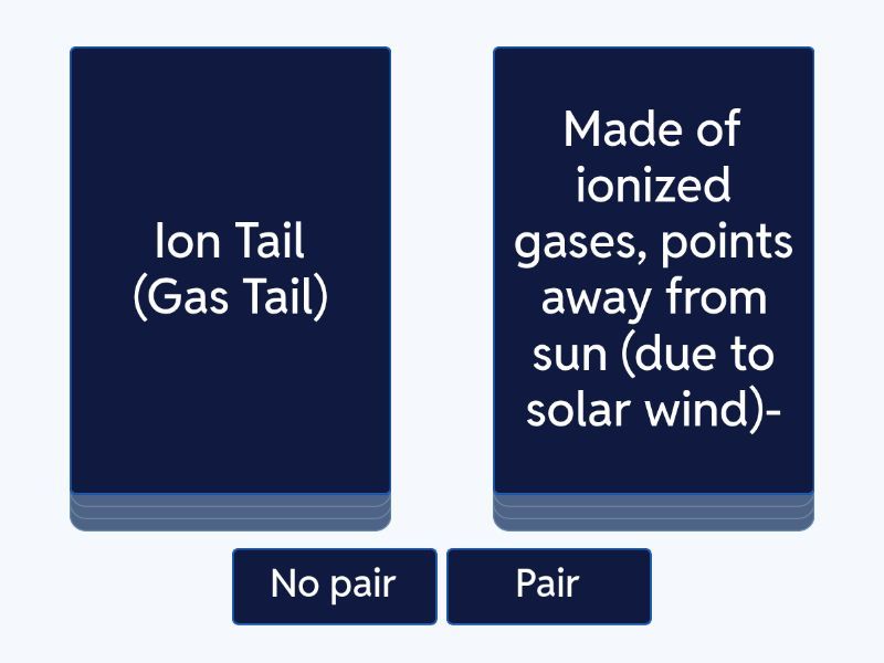 Ion Tail (Gas Tail) - Made of ionized gases, points away from sun (due to solar wind)-, Dust Tail - Made of tiny solid particles pushed away by sunlight pressure, Short-Period Comets - Orbit sun in under 200 years, most from Kuiper Belt, Long-Period Comets - From Oort cloud, take thousands to millions of years to orbit the Sun.,