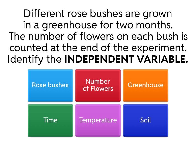 1) Different rose bushes are grown in a greenhouse for two months. The number of flowers on each bush is counted at the end of the experiment. Identify the INDEPENDENT VARIABLE. a) Rose bushes b) Number of Flowers c) Greenhouse d) Time e) Temperature f) Soil 2) Different rose bushes are grown in a greenhouse for two months. The number of flowers on each bush is counted at the end of the experiment. Identify the DEPENDENT VARIABLE. a) Rose bushes b) Number of Flowers c) Greenhouse d) Time e) Temperature f) Soil 3) Different rose bushes are grown in a greenhouse for two months. The number of flowers on each bush is counted at the end of the experiment.Identify the CONSTANTS a) Rose bushes b) Number of flowers c) Greenhouse d) Time e) Temperature f) Soil 4) You water three sunflower plants with salt water. Each plant receives a different concentration of salt solutions. After a two-week period, the height is measured. Identify the INDEPENDENT VARIABLE. a) Time b) Concentration of Salt Solution c) Location d) Measurement tool e) Height f) Type of Sunflower plant 5) You water three sunflower plants with salt water. Each plant receives a different concentration of salt solutions. After a two-week period, the height is measured. Identify the DEPENDENT VARIABLE.. a) Time b) Concentration of Salt Solution c) Location d) Measurement tools e) Height f) Type of Sunflower plant 6) You water three sunflower plants with salt water. Each plant receives a different concentration of salt solutions. After a two-week period, the height is measured. Identify the CONSTANTS. a) Time b) Concentration of Salt Solution c) Location d) Measurment tools e) Height f) Type of Sunflower plant