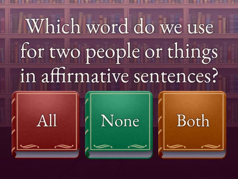 1) Which word do we use for two people or things in affirmative sentences? a) All b) None c) Both 2) Which word do we use for more than two people or things in affirmative sentences? a) All b) Either c) Neither 3) Which word means “not one and not the other”? a) Either b) Both c) Neither 4) Which word means “not any of them”? a) None b) All c) Both 5) Which word means “one or the other — it doesn’t matter which”? a) Either b) Neither c) All 6) “Both” takes a ______ verb. a) Singular b) Plural c) Either singular or plural 7) “All” takes a ______ verb. a) Singular b) Plural c) Singular or plural 8) “Neither” gives the sentence a ______ meaning. a) Positive b) Negative c) Question 9) “None” is used for ______ than two people or things. a) Two b) More c) Less 10) “Either” is used for ______ people or things. a) Two b) More than two c) One
