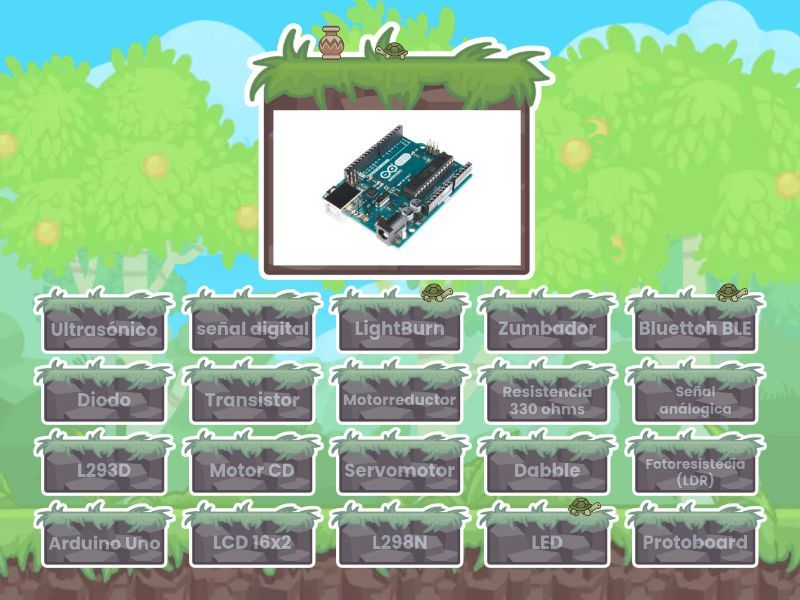 Arduino Uno, Servomotor, Resistencia 330 ohms, Diodo, Motorreductor, L293D, LightBurn, LCD 16x2, Protoboard, señal digital, Señal análogica, LED, L298N, Bluettoh BLE, Motor CD, Fotoresistecia (LDR), Ultrasónico, Transistor, Dabble, Zumbador,