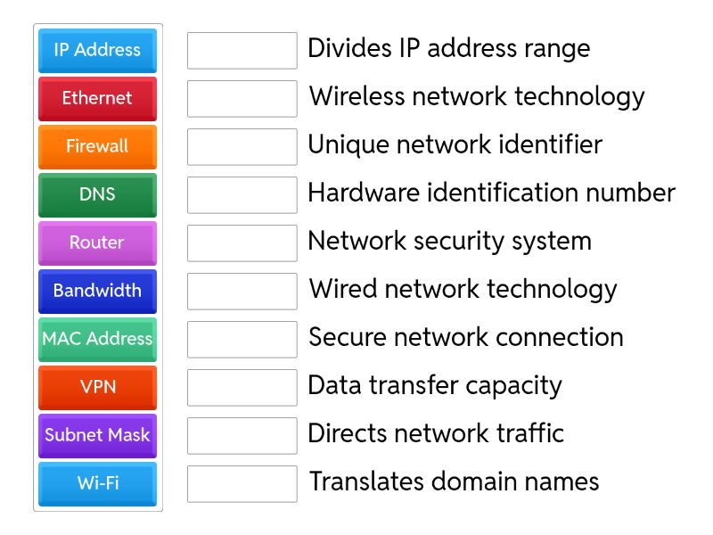 IP Address - Unique network identifier, Router - Directs network traffic, Subnet Mask - Divides IP address range, DNS - Translates domain names, MAC Address - Hardware identification number, Firewall - Network security system, Ethernet - Wired network technology, Wi-Fi - Wireless network technology, VPN - Secure network connection, Bandwidth - Data transfer capacity,