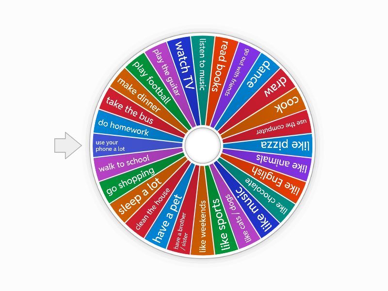 1) do homework 2) take the bus 3) make dinner 4) play football 5) play the guitar 6) watch TV 7) listen to music 8) read books 9) go out with friends 10) dance 11) draw 12) cook 13) use the computer 14) like pizza 15) like animals 16) like English 17) like chocolate 18) like music 19) like cats / dogs 20) like sports 21) like weekends 22) have a brother / sister 23) have a pet 24) clean the house 25) sleep a lot 26) go shopping 27) walk to school 28) use your phone a lot
