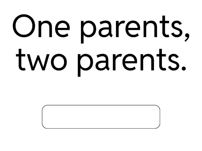 I have one sisters., I have two brother., My mother and father is my parents., My childs are ten and twelve., My sister Sue and my sister Mary is my sisters., I have three daughter., One parents, two parents., My brother Tom and my brother Mark are my brother., I have one sons., Do you have any childrens?, I have one brothers and two sisters., My son and daughter are my childs., A parents helps me a lot., I have two child., My parents is kind., I have one children..