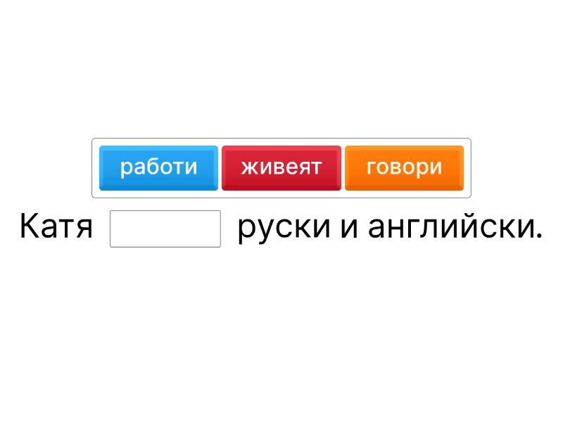 Катя ____ руски и английски. Щефан е от Германия, но ____ като мениджър във Варна. Виктория и Изабел ____ в Лондон. Господин Петров и аз ____ в една конференция. Парис, ____ ли Елена? Невена ____ медицина в Тракийския университет. Климент и Ана не ____ български, но разбират всичко. Аз и Кристин много ____ България.