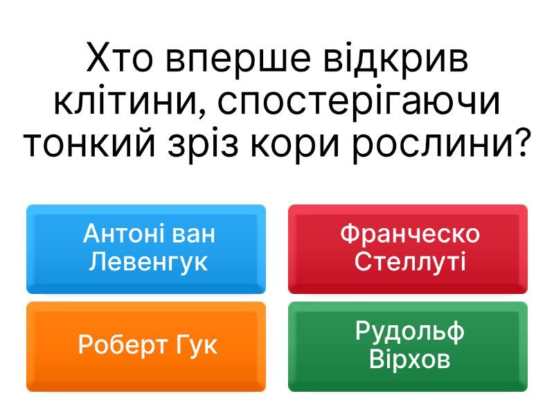 1) Хто вперше відкрив клітини, спостерігаючи тонкий зріз кори рослини? a) Антоні ван Левенгук b) Франческо Стеллуті c) Роберт Гук d) Рудольф Вірхов 2) Як називається наука, що вивчає клітини, їхню будову і процеси життєдіяльності? a) Генетика b) Фізіологія c) Цитологія d) Гістологія 3) Хто вперше побачив бактерії та клітини сперматозоїдів? a) Роберт Гук b) Франческо Стеллуті c) Луї Пастер d) Антоні ван Левенгук 4) Що є основним приладом для дослідження клітин? a) Телескоп b) Мікроскоп c) Центрифуга d) Лупа 5) Перший світловий (оптичний) мікроскоп був створений у a) XVII ст b) XVI ст c) XV ст d) XVIII 6) Що утворює зображення в світловому мікроскопі? a) Промені світла b) Потік електронів c) Магнітні хвилі d) Ультразвук 7) Хто вперше використав мікроскоп для дослідження бджоли? a) Макс Кноль b) Франческо Стеллуті c) Рудольф Вірхов d) Роберт Гук 8) Максимальне збільшення сучасного світлового мікроскопа становить a) 100 разів b) 10 тис. разів c) 2–2,5 тис. разів d) 400 разів 9) Хто сконструював перший електронний мікроскоп? a) Роберт Гук b) Луї Пастер c) Антоні ван Левенгук d) Макс Кноль і Ернст Руска 10) Яка речовина використовується для збереження мікропрепаратів? a) Хлорофіл b) Канадський бальзам c) Спирт d) Йод 11) Як називається метод, за допомогою якого вчені вирощують клітини поза організмом для досліджень? a) Метод культури клітин b) Метод електронної мікроскопії c) Метод центрифугування d) Метод світлової мікроскопії 12) У чому головна відмінність електронного мікроскопа від світлового? a) Дає менше збільшення b) Використовує сонячне світло c) Замість світла використовуються електрони d) Не потребує лінз