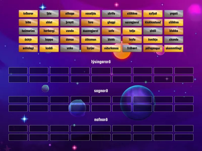 lýsingarorð: sanngjarnt, yngsti, ósanngjarnt, æðislegt, frábært, þreytt, skemmtilegt, óskýr, syfjuð, sagnorð: sofa, vaka, slökkva, kveikja, telja, skunda, leyfa, fara, byrjar, skrifa, athuga, slást, stökkva, dansa, vanda, hoppa, bíða, viðurkenna, nafnorð: klukka, ljós, gluggi, skóli, blokk, heimurinn, útkoman, klukkustund, páfagaugur, herbergi, tvíburar, koddi, vasaljós,
