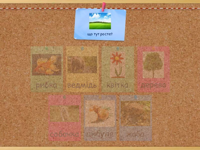 квітка - що тут росте?, собачка - хто тут живе?, цибуля - Тут росте, ведмідь - хто тут зимує?, рибка - хто тут плаває?, дерево - росте тут, жаба - хто тут стрибає?,