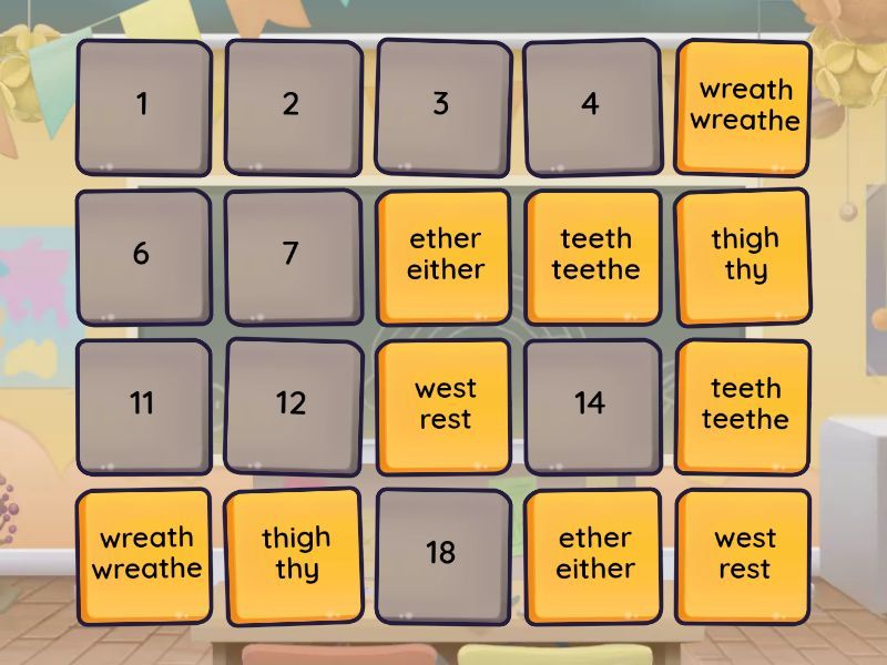 thigh thy, ether either, wreath wreathe, teeth teethe, west rest, witch rich, went rent, war roar, collect correct, glass grass,