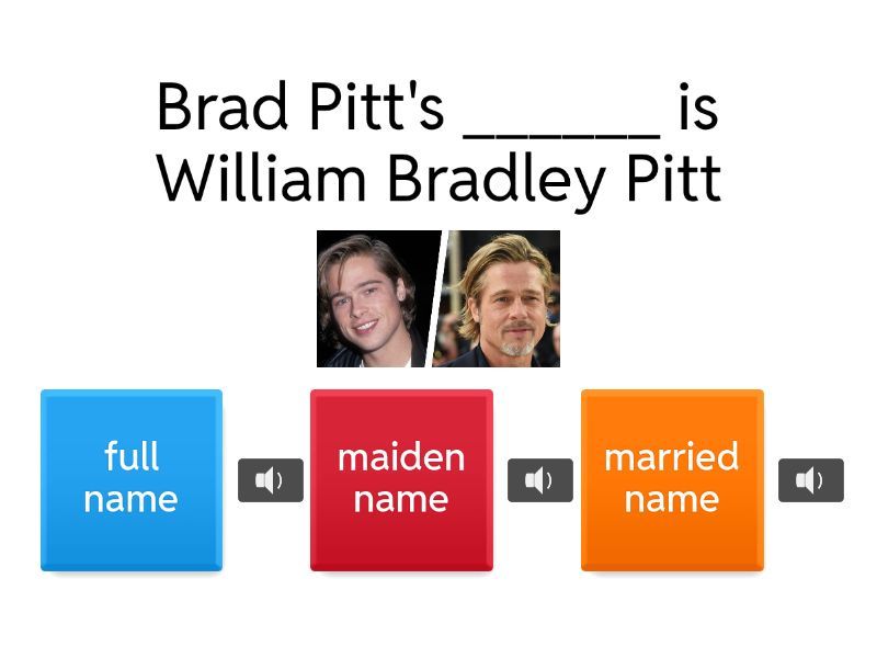 1) Brad Pitt's ______ is William Bradley Pitt a) full name b) maiden name c) married name 2) Vlad is ______ Vladyslav a) pseudonym b) short for c) initials 3) J.K. Rowling's ______ stand for Joanne Kathleen a) maiden name b) pseudonym c) initials 4) Before I got married, my ______ was Jones. After I got married, I took my husband's surname Smith a) maiden name b) initials c) full name 5) Before I got married, my maiden name was Jones. After I got married, I took my husband's surname Smith which is my ____ a) pseudonym b) married name c) maiden name 6) My name is Marie. But my friends call me Riri. It's my _____ a) initials b) short for c) nickname 7) This is Jennifer Joanna Aniston. Jennifer is her ____ a) first name b) middle name c) surname 8) This is Jennifer Joanna Aniston. Joanna is her ____ a) first name b) middle name c) surname 9) Before using her real name, Agatha Christie published her stories under the ______ Mary Westmacott a) surname b) initials c) pseudonym 10) Her name is Jessica and her great-grandmother's name is Jessica too. She is _____ her great-grandmother a) short for b) named after c) pseudonym 11) His name's Edward but he ____ Ed _____ a) is called _____ for short b) nickname c) named after 12) Her name was Sarah. But when she was 16, she ________ Elizabeth a) is short for b) maiden name c) changed her name to