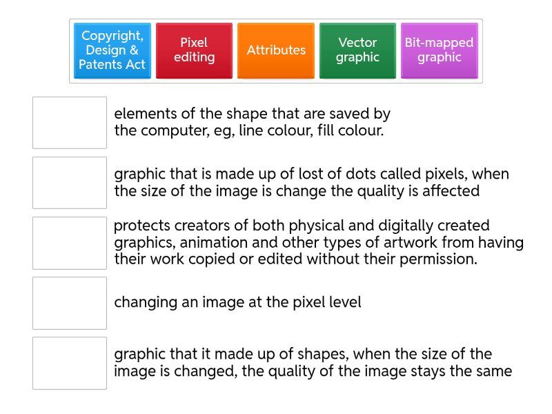 Bit-mapped graphic - graphic that is made up of lost of dots called pixels, when the size of the image is change the quality is affected, Vector graphic - graphic that it made up of shapes, when the size of the image is changed, the quality of the image stays the same, Attributes - elements of the shape that are saved by the computer, eg, line colour, fill colour., Copyright, Design & Patents Act - protects creators of both physical and digitally created graphics, animation and other types of artwork from having their work copied or edited without their permission., Pixel editing - changing an image at the pixel level,