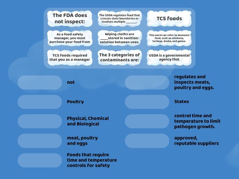 Pathogens do not grow well in TCS food - False, TCS foods - Foods that require time and temperature controls for safety, TCS and ready-to-eat food are the most likely tpes of food to become unsafe - True, Foodborne illnesses - is a disease transmitted to people by food., Contaminants are divided into ____ categories. - Three, The 3 categories of contaminants are: - Physical, Chemical and Biological, There are ____ common food-handling mistakes or risk factors that can cause a foodborne illness. - Five, Pathogens can be transferred from one surface or food to another This is called: - Cross-contamination, Ready-to-eat food - food that can be eaten without further preparation., USDA is a governmental agency that - regulates and inspects meats, poultry and eggs., This word can refer to domestic fowl, such as chickens, turkeys, ducks, and geese. - Poultry, The USDA regulates food that crosses state boundaries or involves multiple _______. - States, A good food service manager must train staff - when they are first hired, and on an ongoing basis., State and local health departments - write the codes that regulate retail and foodservice operations., The FDA does not inspect: - meat, poultry and eggs, They conduct research into the causes of foodborne-illness outbreaks. - CDC and PHS, CDC stands for - Center for Disease Control and is based in Atlanta, GA., As the Manager, if you see unsafe food handling you must - take corrective action and retrain staff as needed., Wiping cloths are ____stored in sanitizer solution between uses. - not, An illness is considered a foodborne outbreak if ___or more people have the same symptoms after eating the same food. - two, Two food handling mistakes you must be aware of as Manager - time-temperature abuse and poor personal hygiene, TCS foods required that you as a manager - control time and temperature to limit pathogen growth., Ready-to-eat foods include: - washed food, cooked food, deli meat, sugar and spices., As manager you must create SOPs otherwise known as: - Standard operating procedures, As a food safety manager, you must purchase your food from - approved, reputable suppliers,