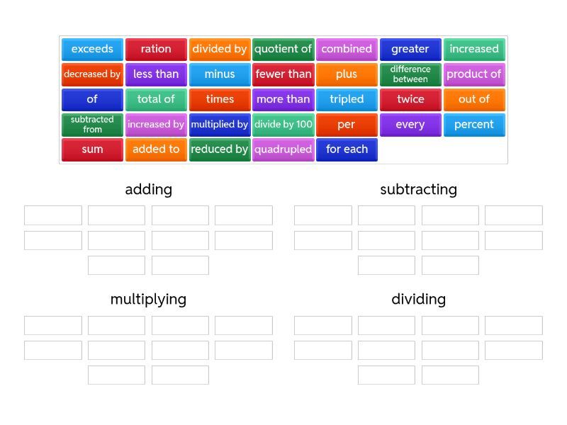 adding : increased by, more than, sum, combined , added to, increased , exceeds, total of , plus, greater, subtracting: difference between, minus, less than, fewer than, decreased by, subtracted from, reduced by , multiplying: product of , multiplied by , times, for each, every, of, twice, tripled , quadrupled , dividing : quotient of , divided by, ration, per, out of , percent, divide by 100,