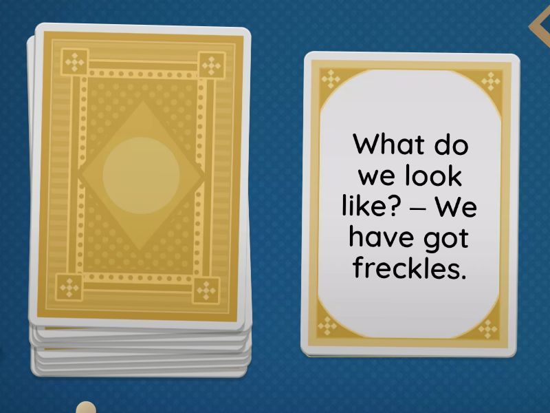 What do you look like? – I have got brown eyes., What do we look like? – We have got short hair., What do you look like? – You have got glasses., What does he look like? – He has got fair hair., What does she look like? – She has got straight hair., What do they look like? – They have got green eyes., What do I look like? – I have got long hair., What do we look like? – We have got freckles., What do you look like? – You have got curly hair..