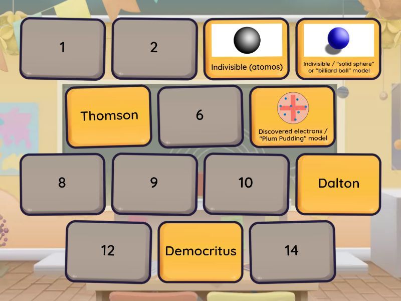 Democritus - Indivisible (atomos), Dalton - Indivisible / "solid sphere" or "billiard ball" model, Thomson - Discovered electrons / "Plum Pudding" model, Rutherford - Dense inner nucleus with discovery of protons / "Nuclear" model, Bohr - Discovered orbitals (where specific numbers of electrons can be found) / "Planetary" model, Chadwick - Discovered neutrons / "Planetary" model, Crookes - Created a tube experiment which showed atoms could give off or have smaller particles,