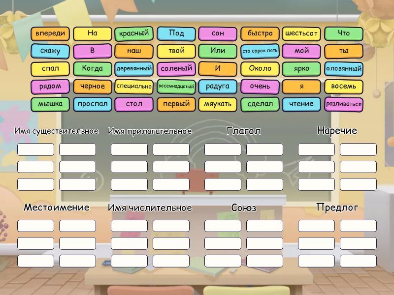 Имя существительное: стол, сон, чтение, радуга, мышка, Имя прилагательное: красный, соленый, деревянный, оловянный, черное, Глагол: сделал, спал, проспал, мяукать, скажу, разливаться, Наречие: быстро, ярко, очень, впереди, рядом , специально, Местоимение: я, ты, твой, мой, наш, Имя числительное: первый, сто сорок пять, восемь, восемнадцатый, шестьсот , Союз: И, Что, Когда, Или, Предлог: В, На, Под, Около,